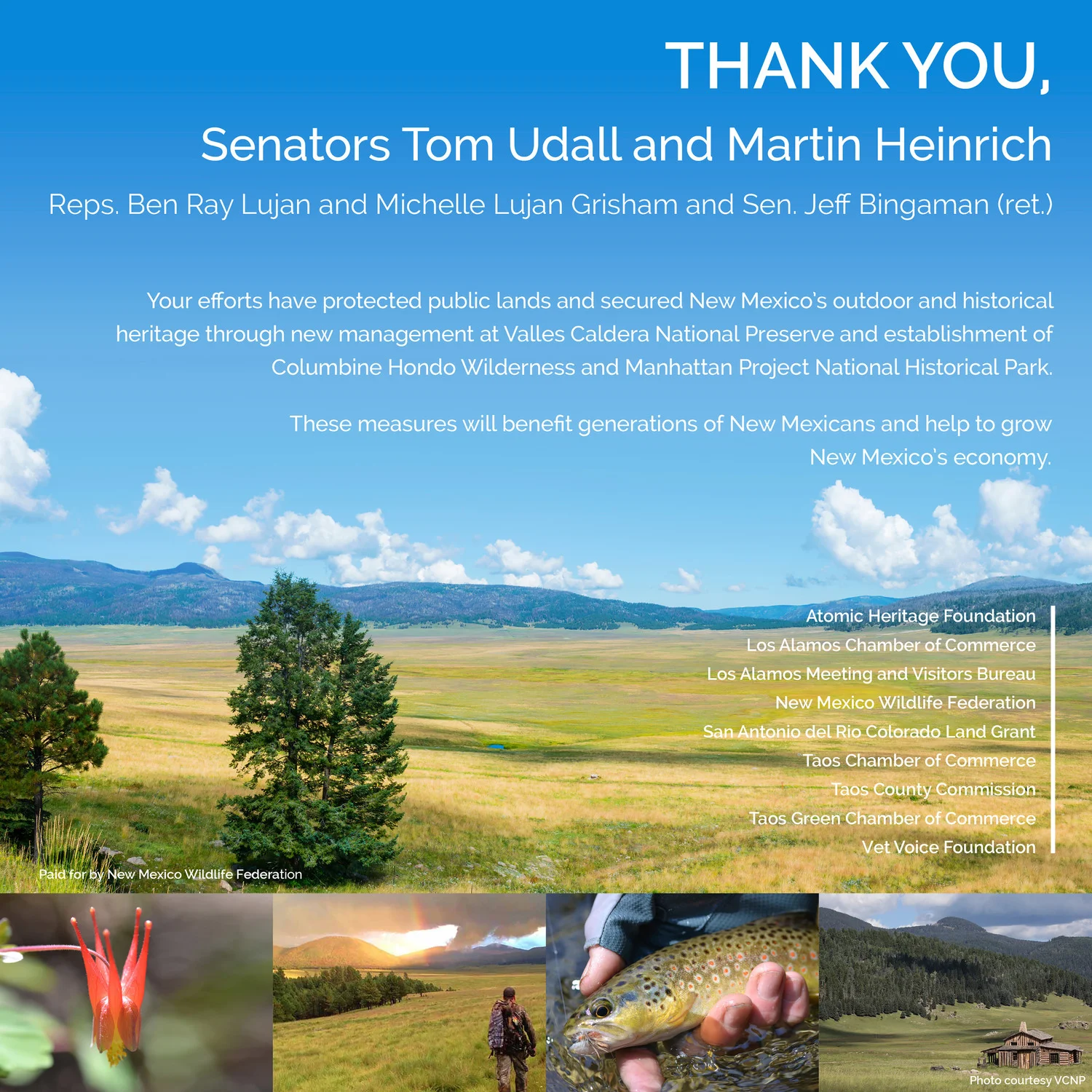 In this instance, I worked with Big Swing and the New Mexico Wildlife Federation to create print ads thanking legislators who advocated for conservation initiatives at the Valles Caldera National Preserve, Columbine Hondo Wilderness area and Manhattan Project National Historic Park.